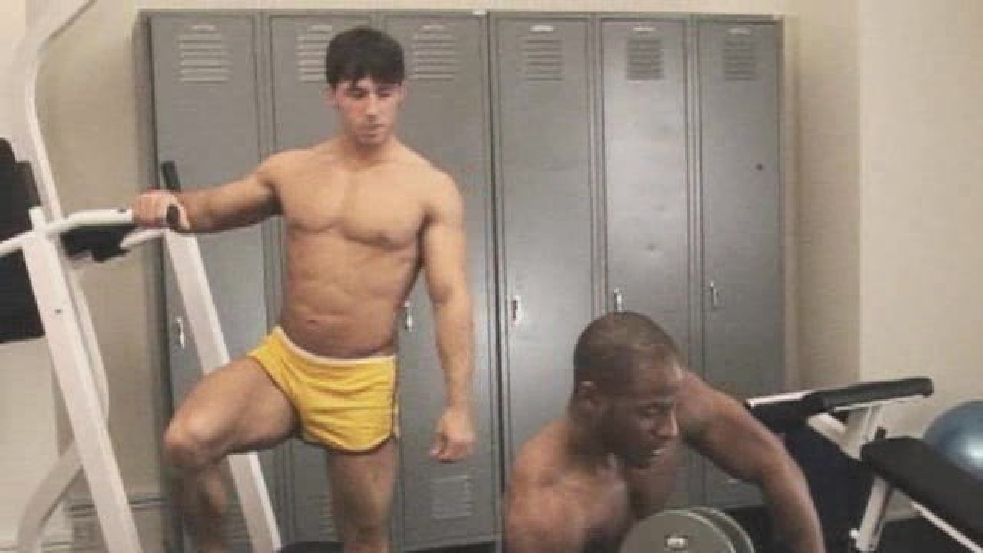 Eddie Diaz and Reese Rideout show how much fun a workout at the gym can be, rubbing their muscular smooth bodies together and making a huge sticky mess all over the weight bench.